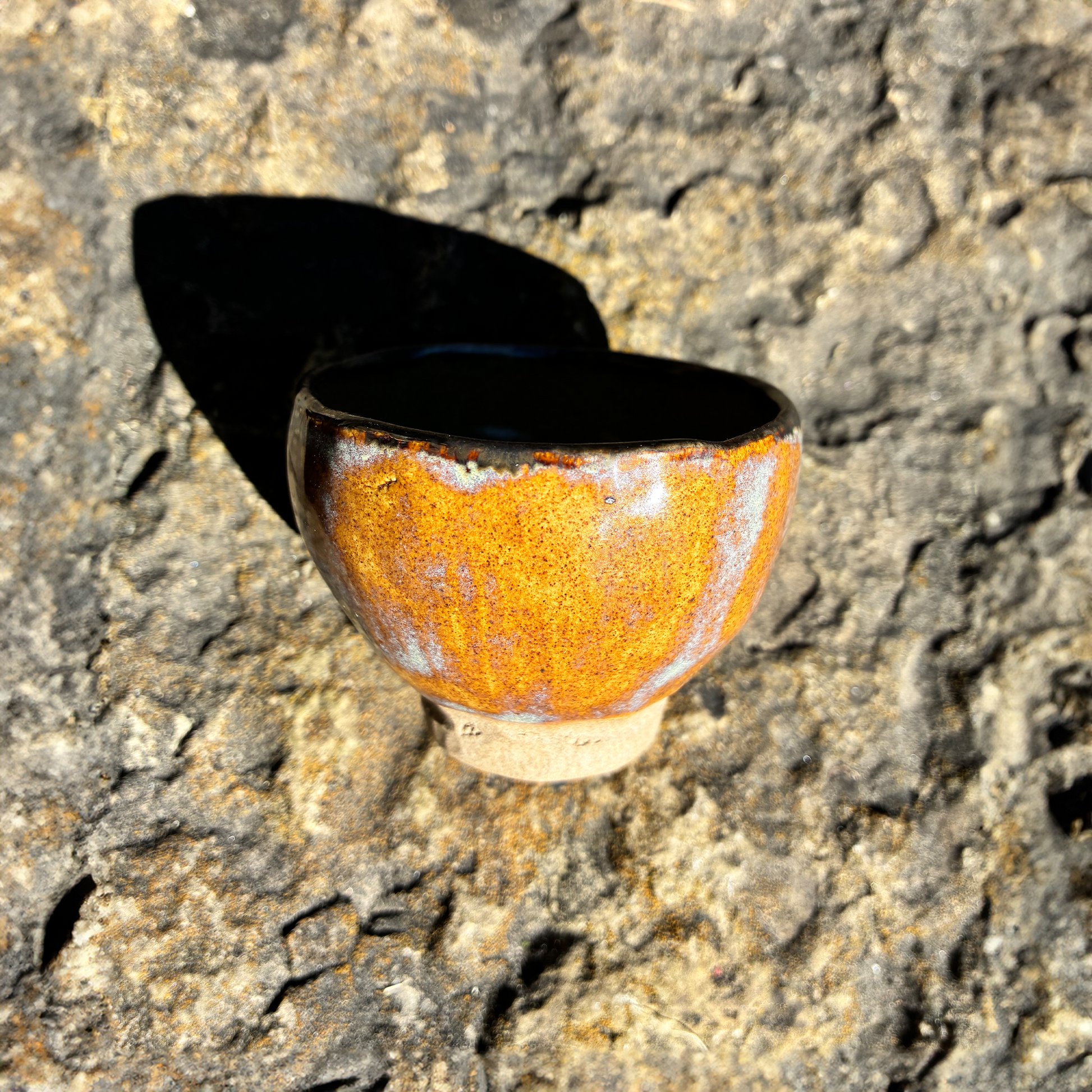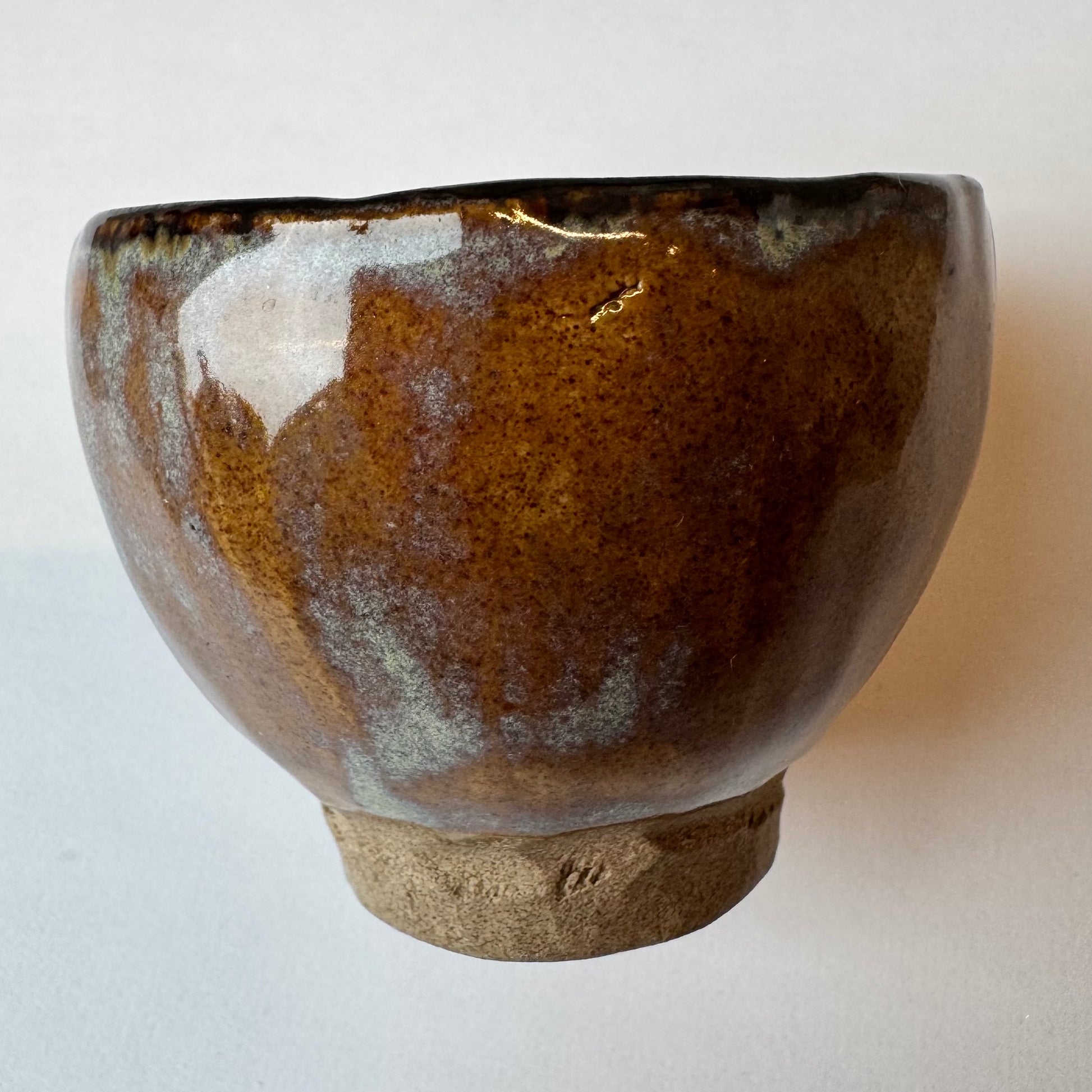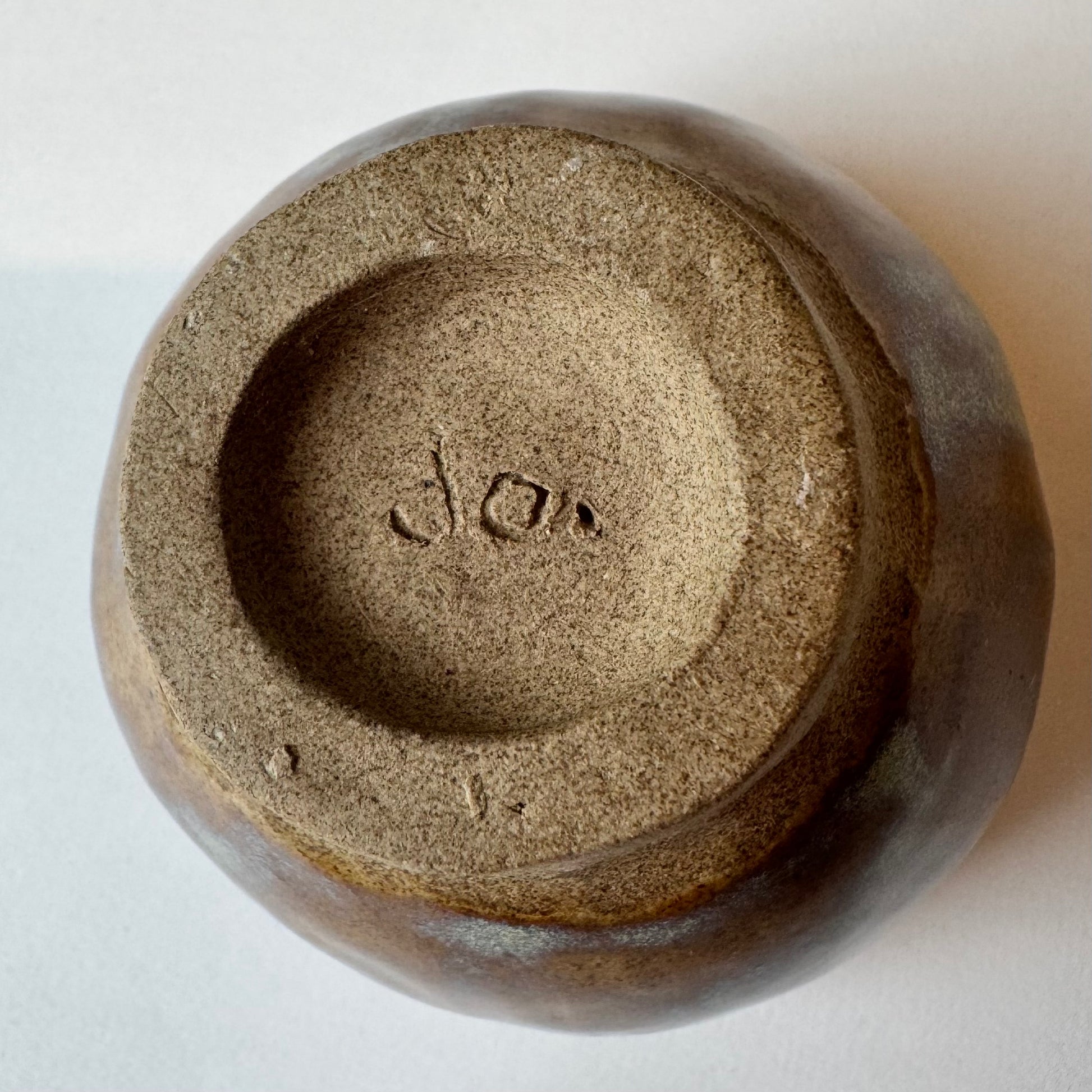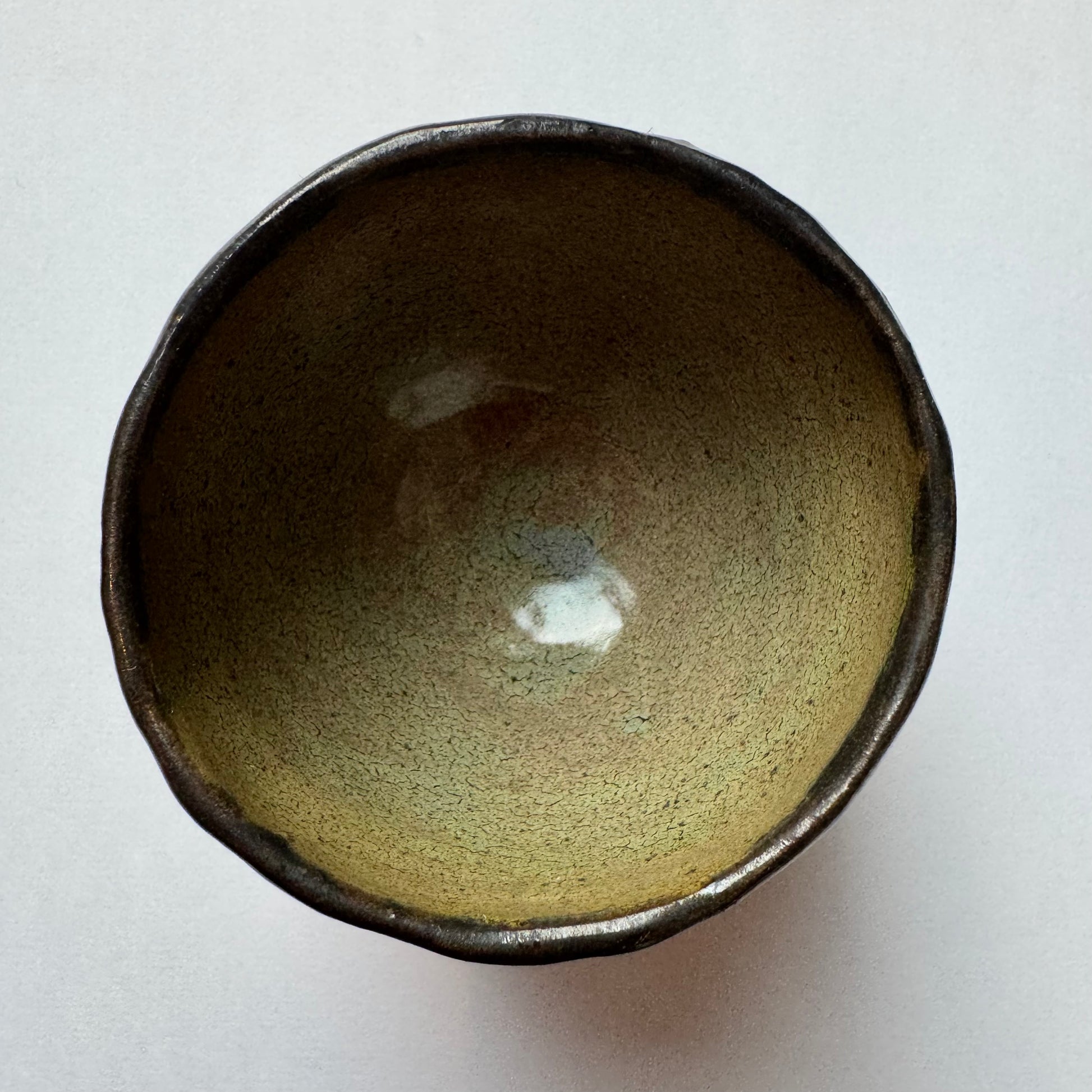 Rudas keramikinis puodelis žalsvu vidum. Talpa – apie 50 ml.