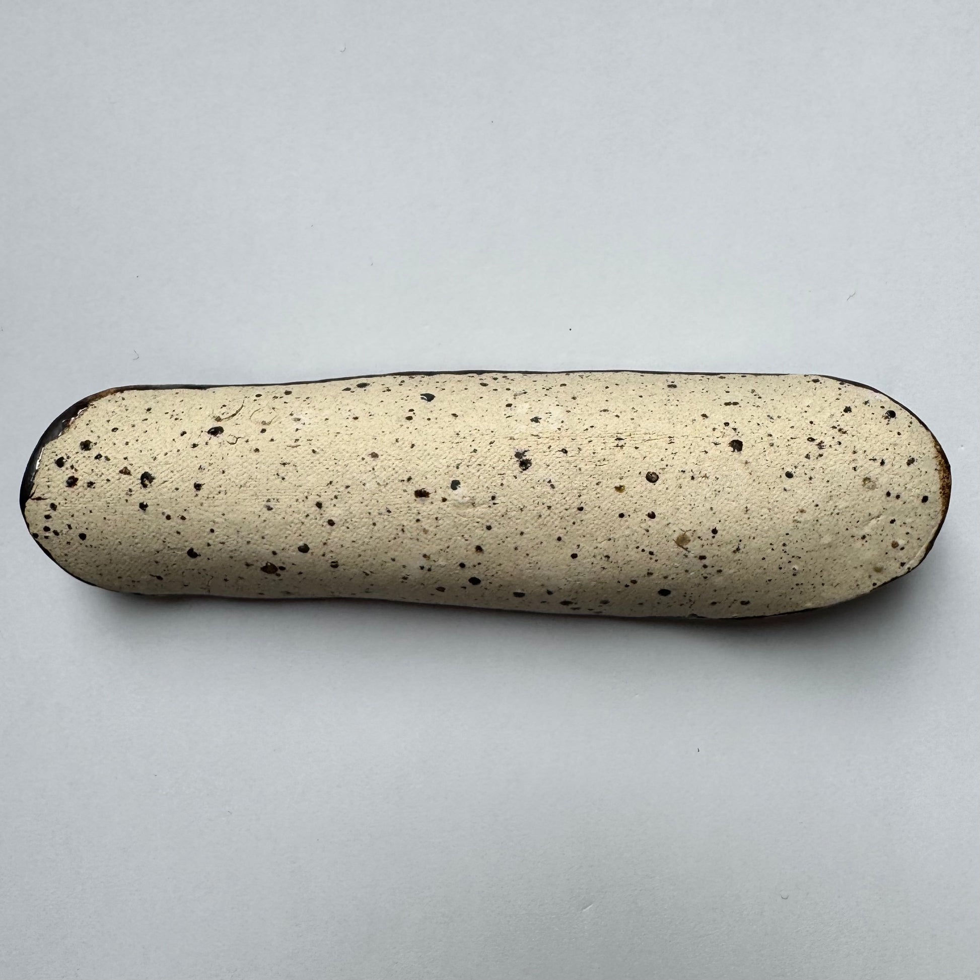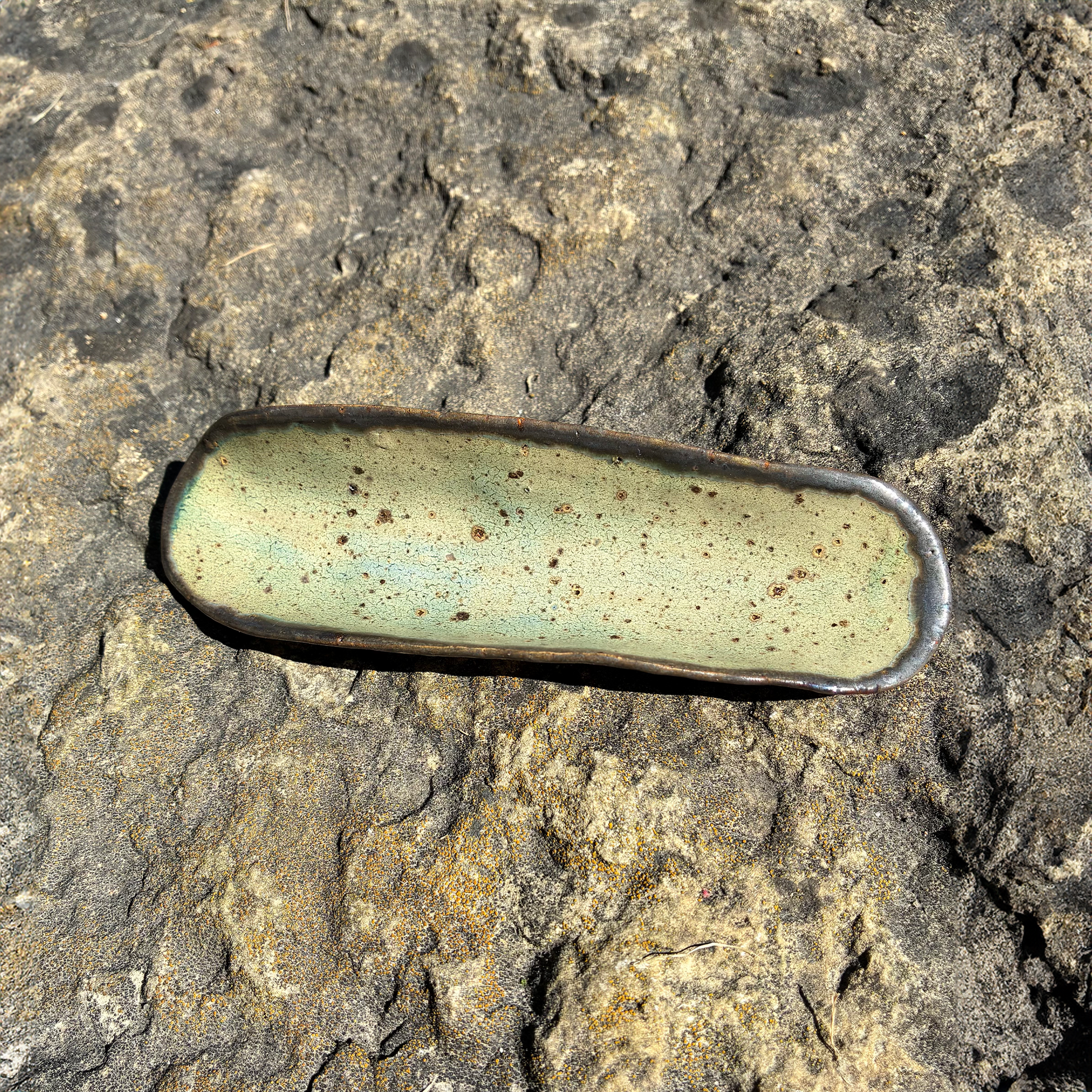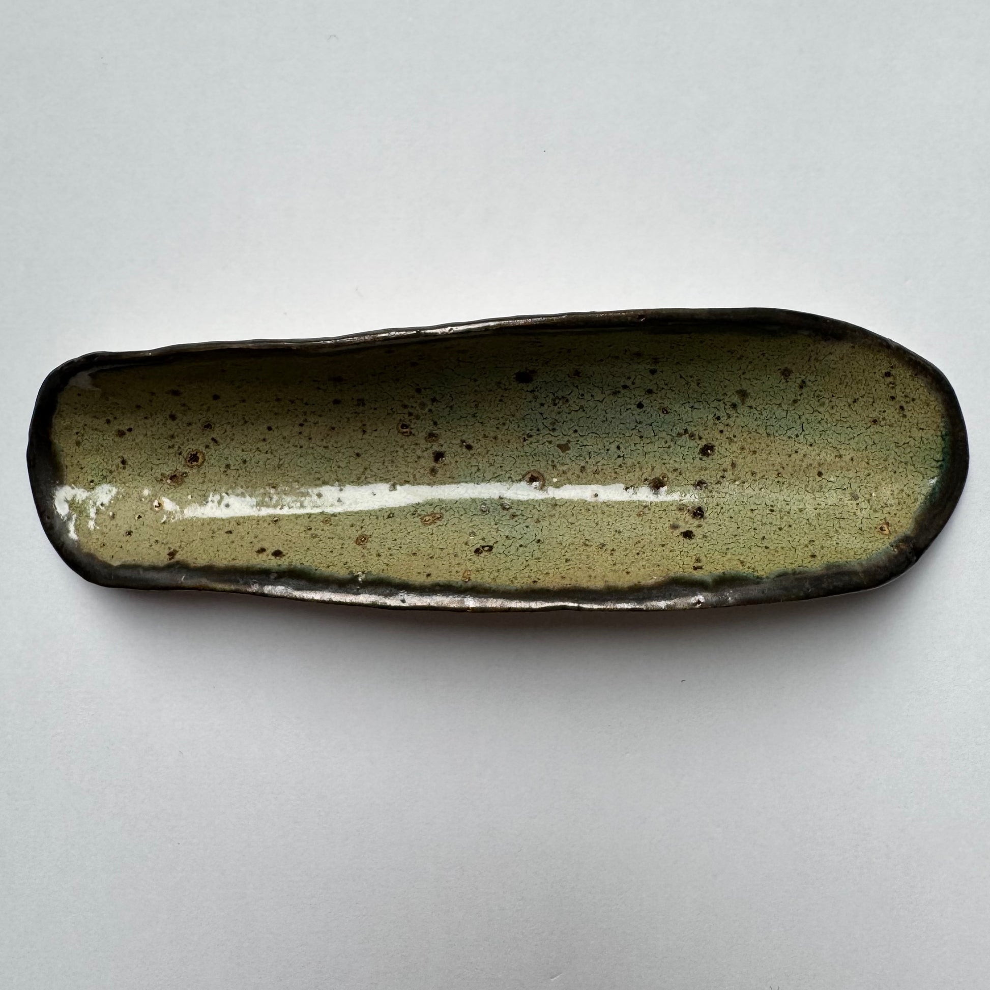 Žalsvas keramikinis samtelis tamsiu krašteliu biriai lapelių arbatai.