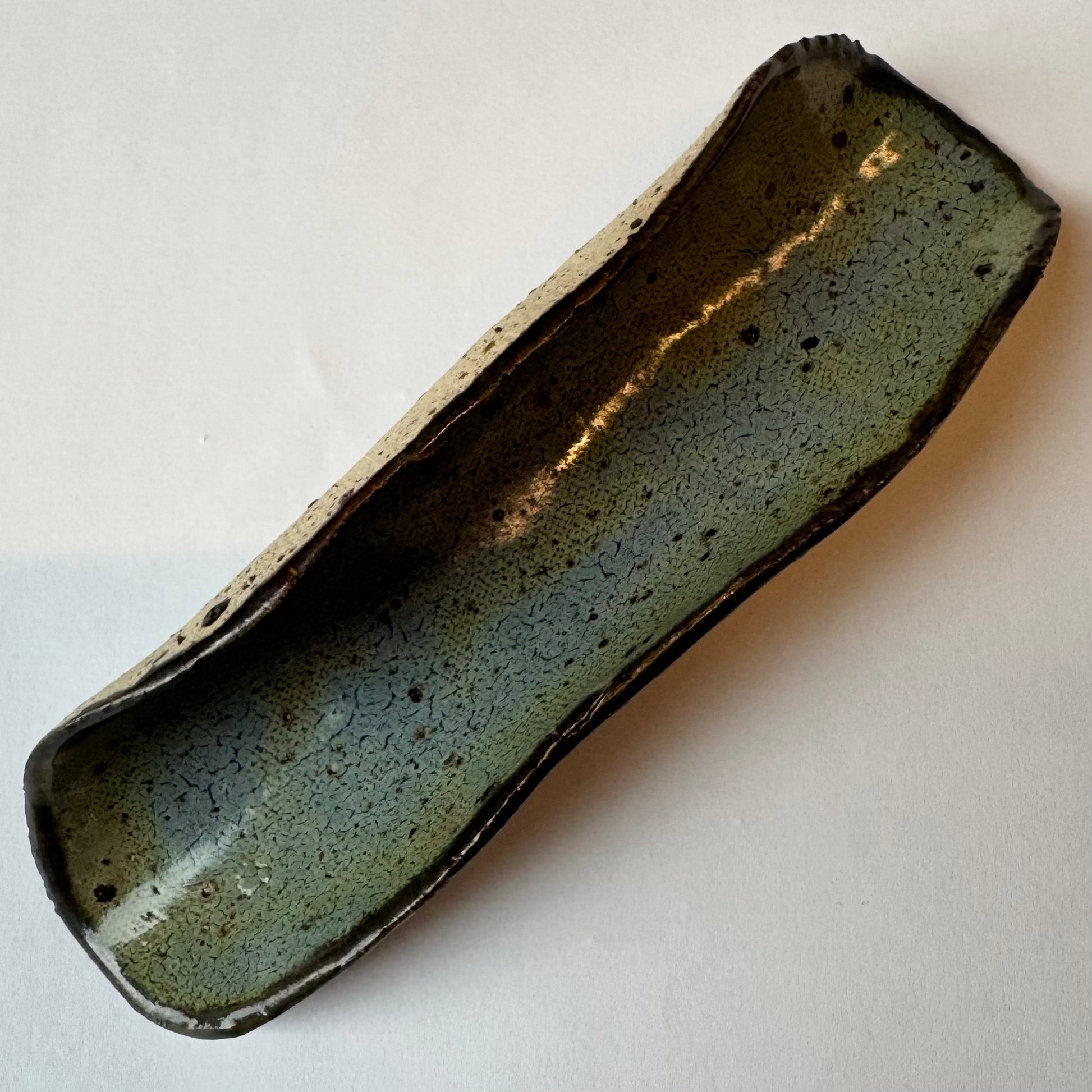Žalsvai žydras keramikinis samtelis biriai lapelių arbatai tamsiu krašteliu.