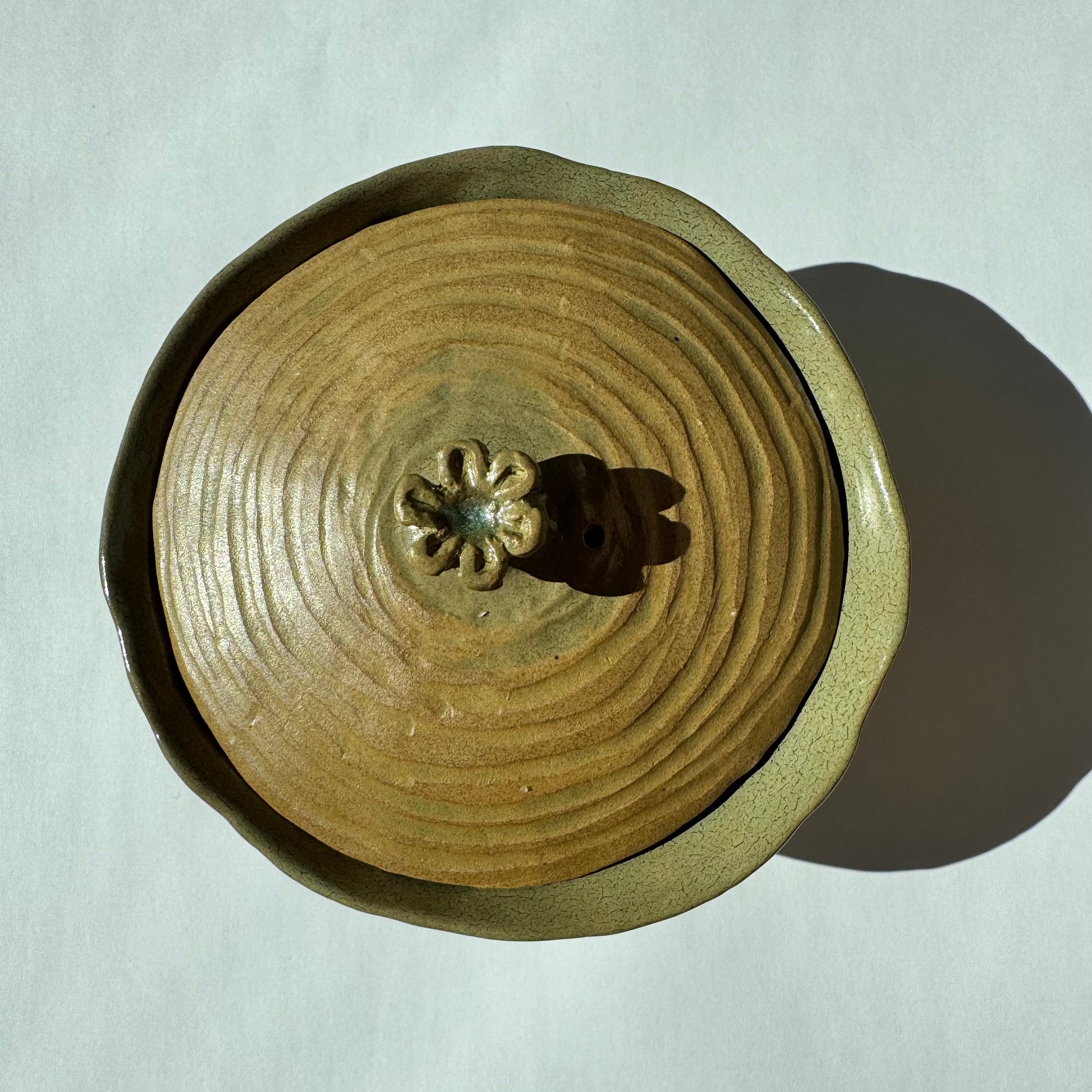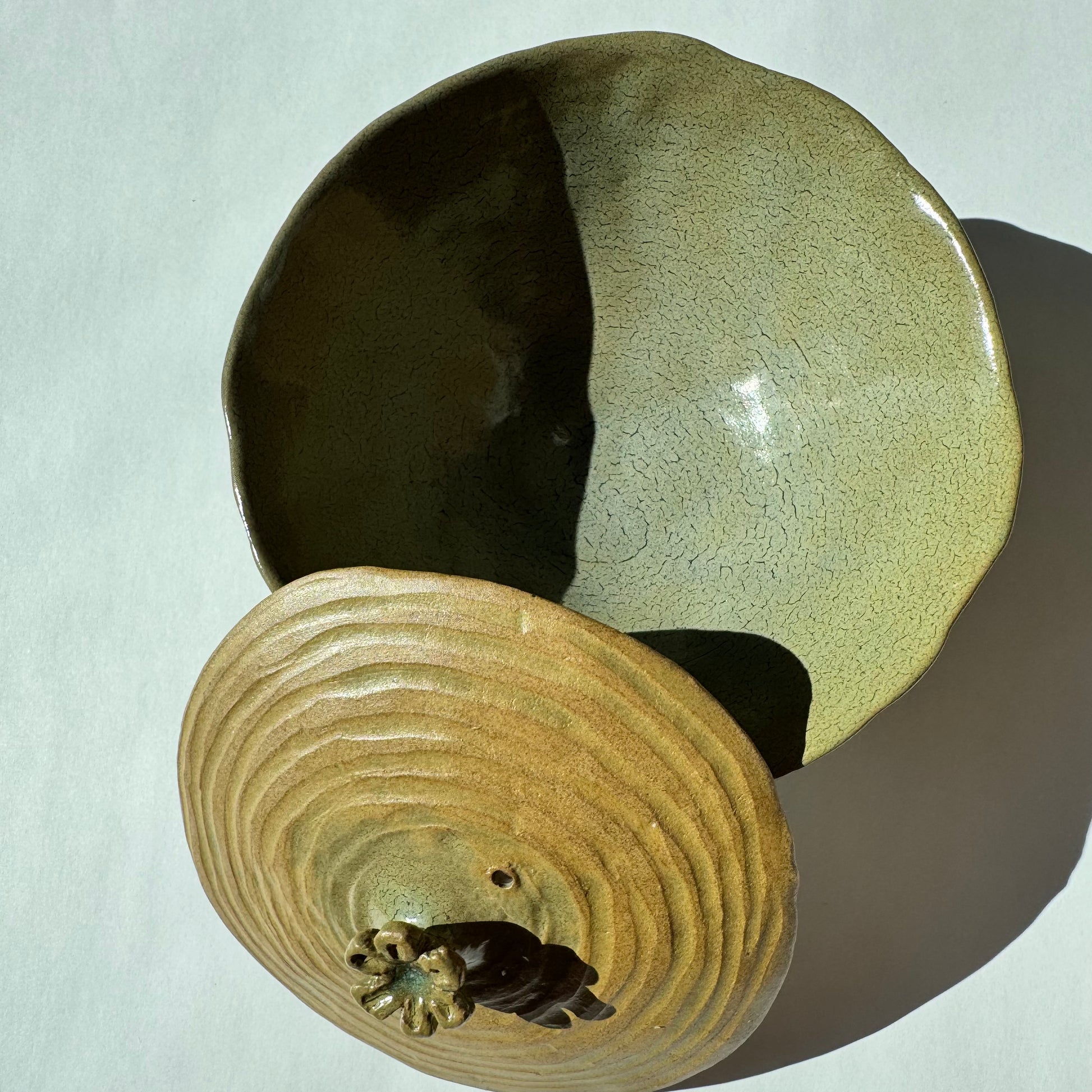 Rusvai žalsvas su nedideliais abstrakčiais ornamentais išorėje.