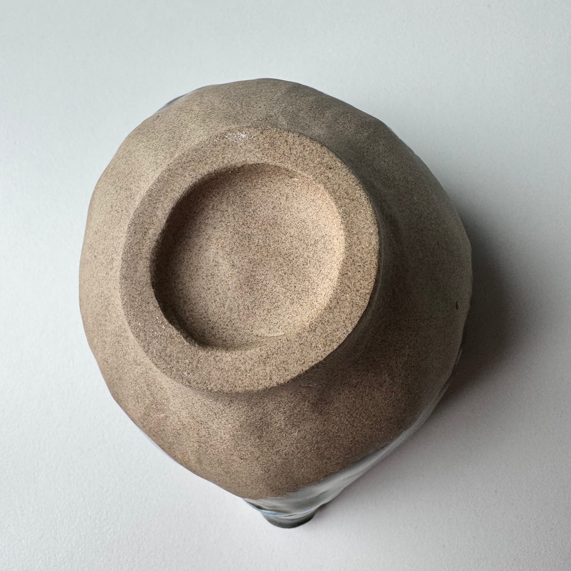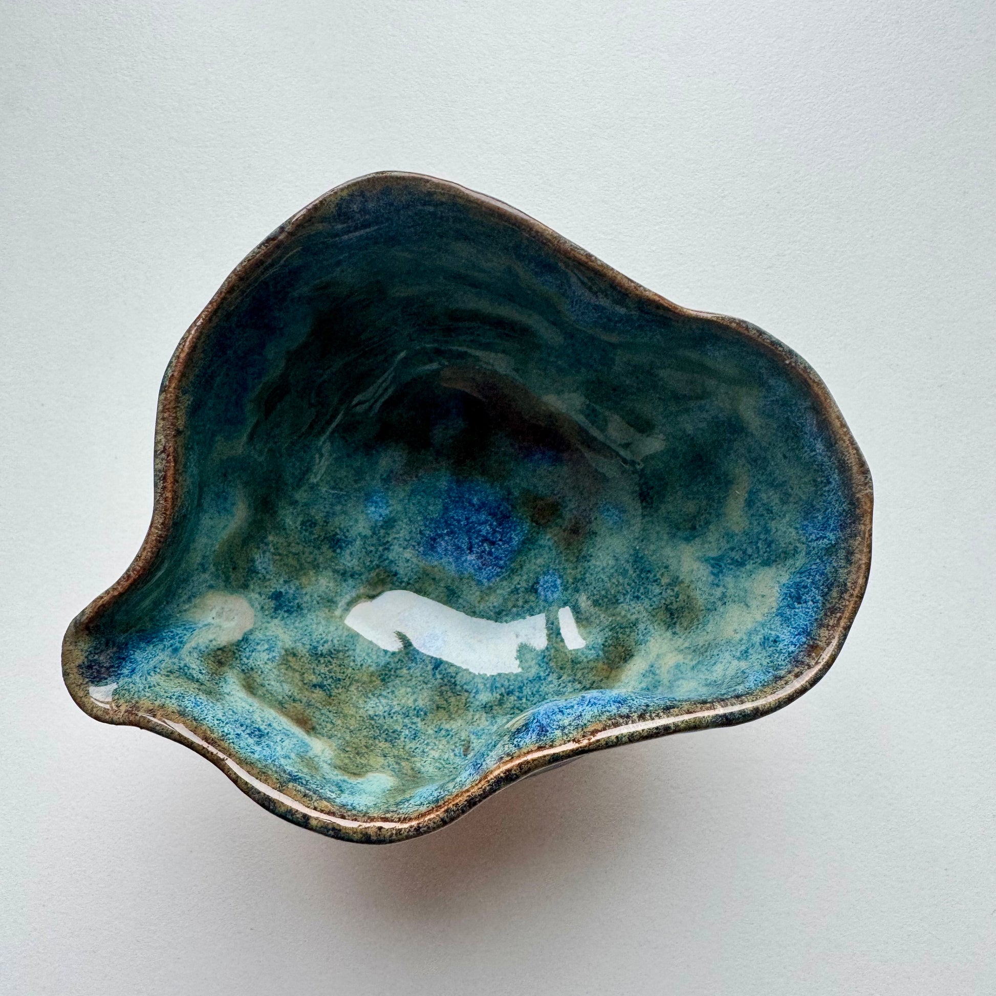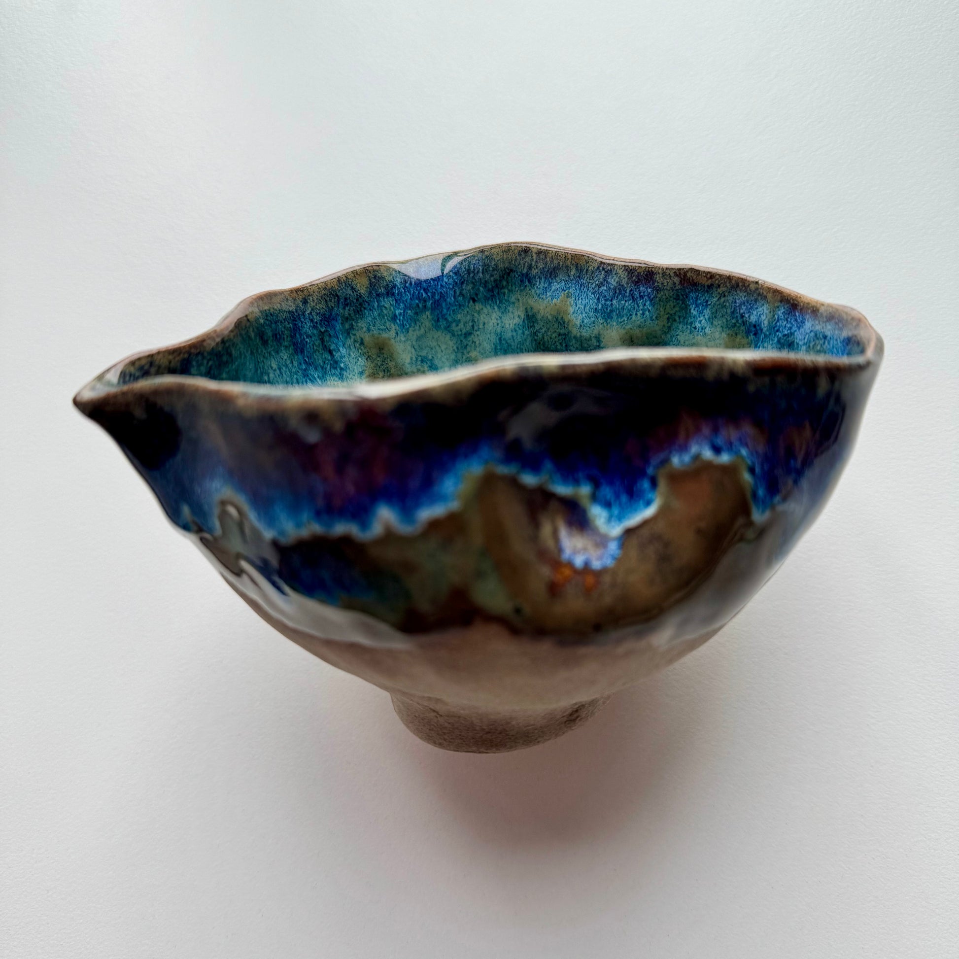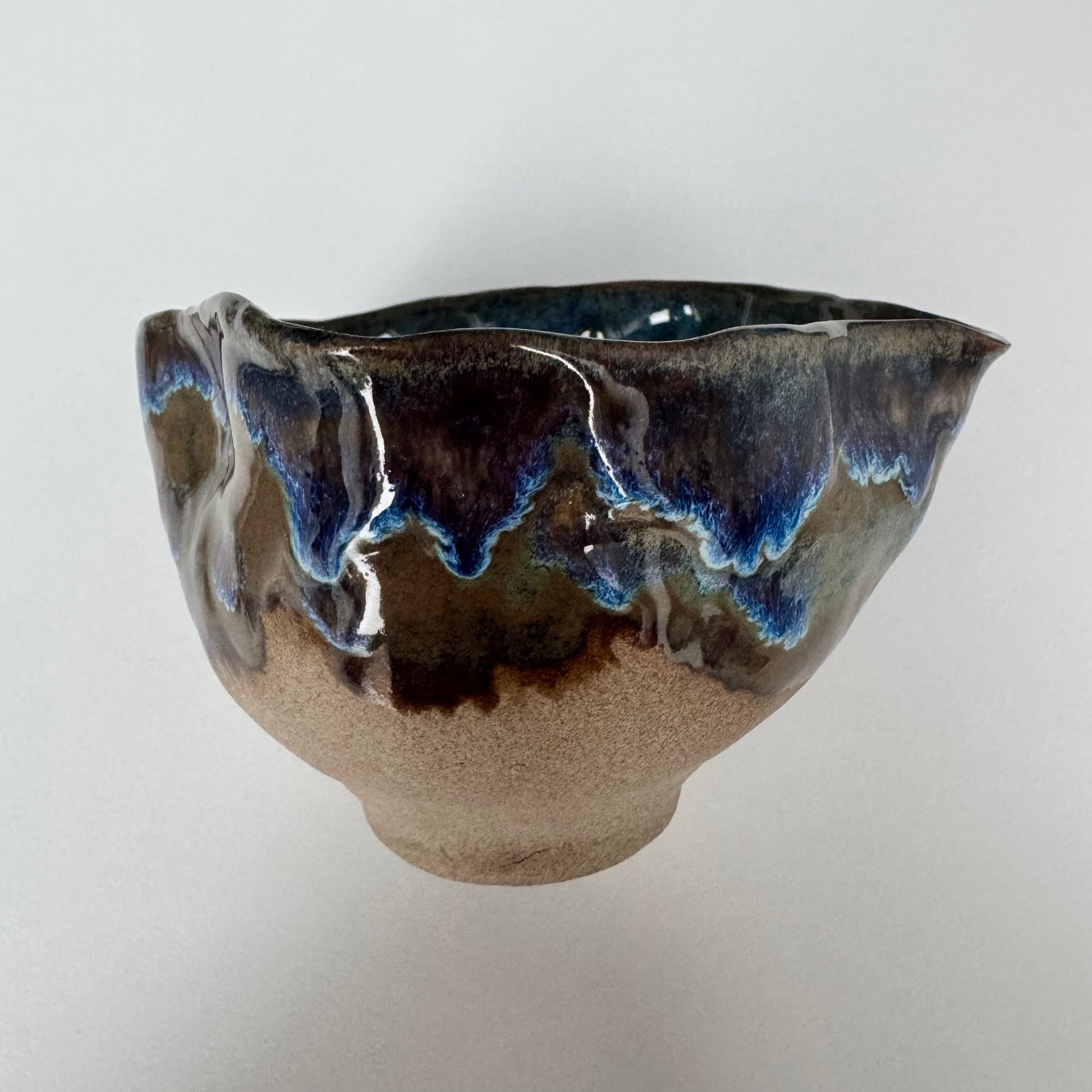 Rusvo molio su rudais ir melsvais abstrakčiais ornamentais. Vidus - margas melsvas su mėlynu taškeliu dugne.